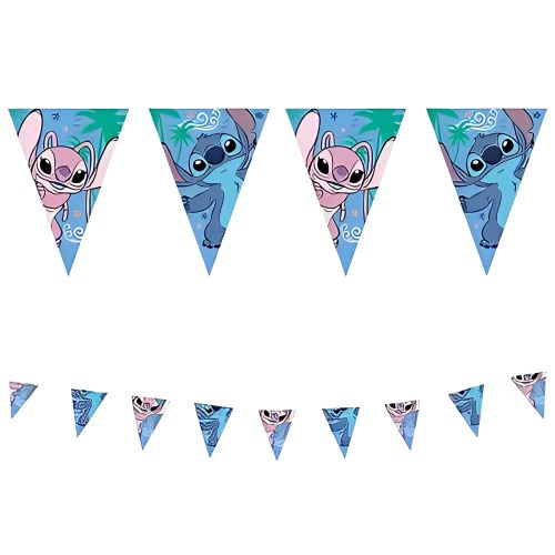 Banneret er 230 cm langt og består af trekantede vimpler i farverige illustrationer af Stitch og Angel i festligt design. Det er perfekt til at hænge op over bordet, i døråbningen, i haven eller på væggen som del af en gennemført temafest.